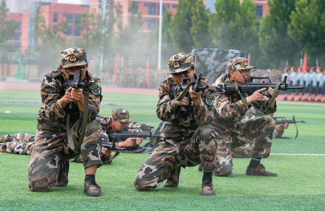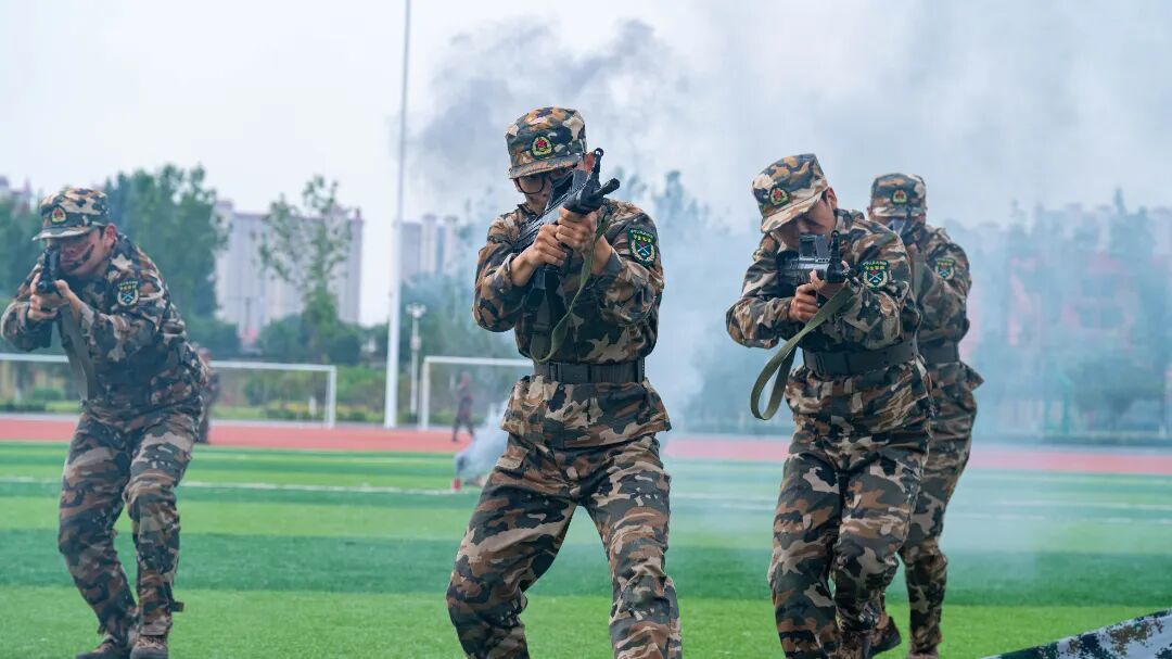 在军训汇演中,同学们以嘹亮的口号、整齐的队列和铿锵的步伐接受了检阅。随后进行的刺杀操、匕首操、摔擒倒功及战地救护军事技能展示,动作标准、气势如虹,充分展现了东科学子英姿飒爽的精神面貌和昂扬向上的青春风采。