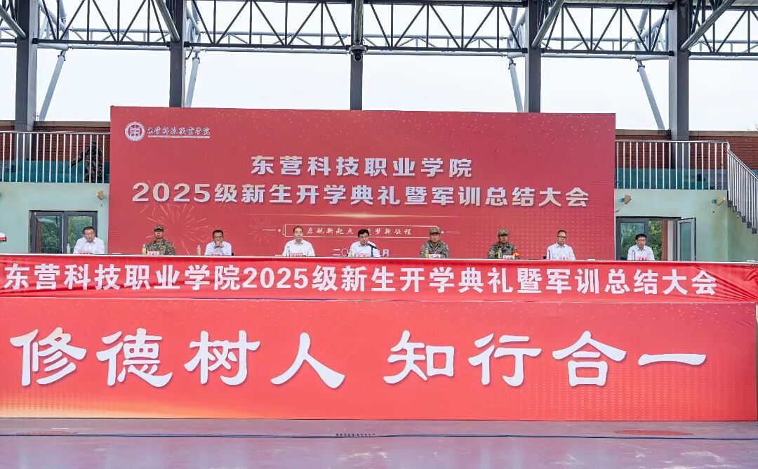 9月22日上午,东营科技职业学院2025级新生开学典礼暨军训总结大会在田径运动场隆重举行。广饶县人民武装部副部长常亮,学校党委书记王志,党委副书记、校长成永江等领导班子成员出席大会。大会由王志主持。