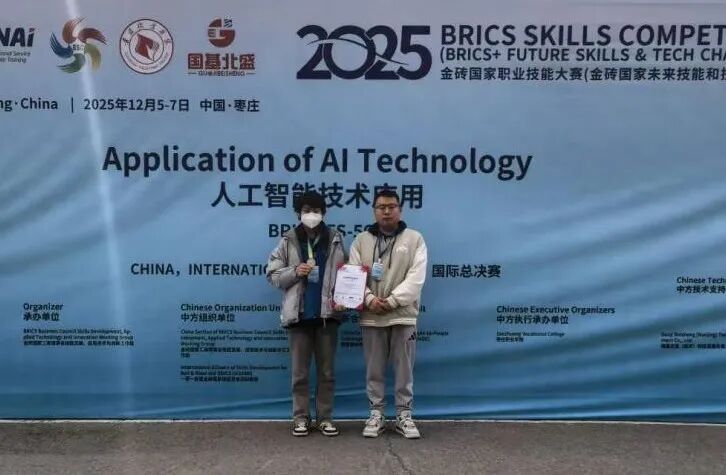 12月5日至7日,2025金砖国家职业技能大赛“人工智能技术应用”赛项国际总决赛在枣庄职业学院举办,本次大赛共吸引来自中国、哈萨克斯坦、俄罗斯、南非、印度的70余支队伍报名参赛,我校信息工程学院学子张东战在朱永贵教师的悉心指导下,荣获国际总决赛一等奖,为学校赢得殊荣。