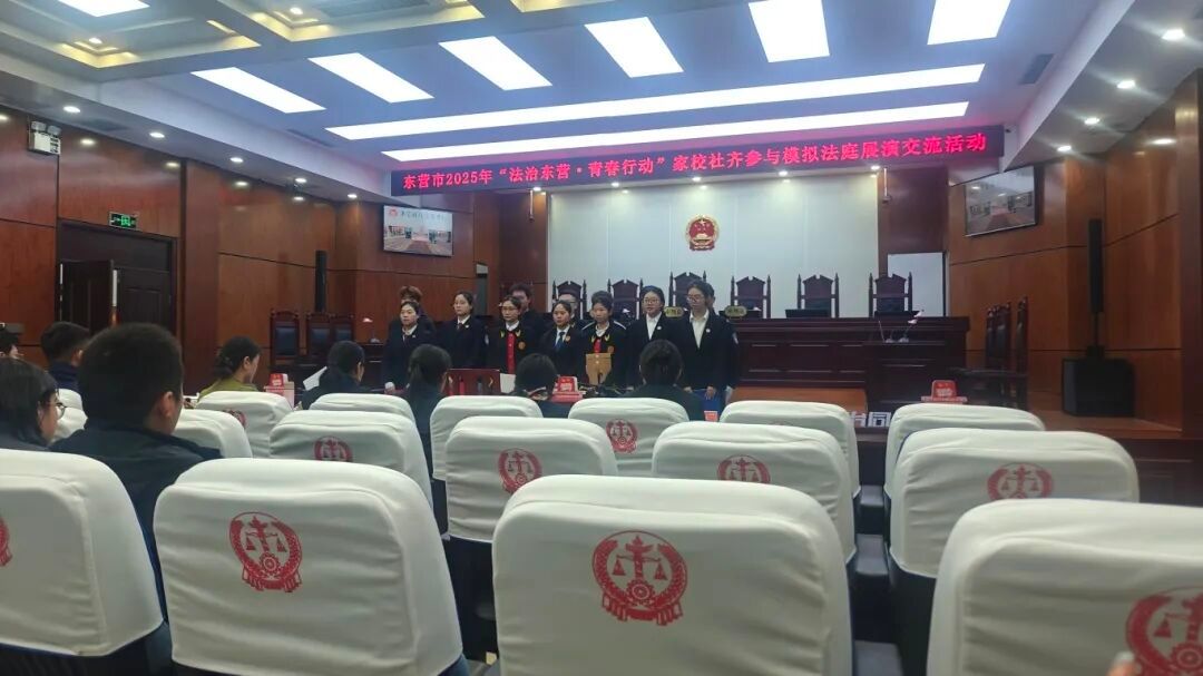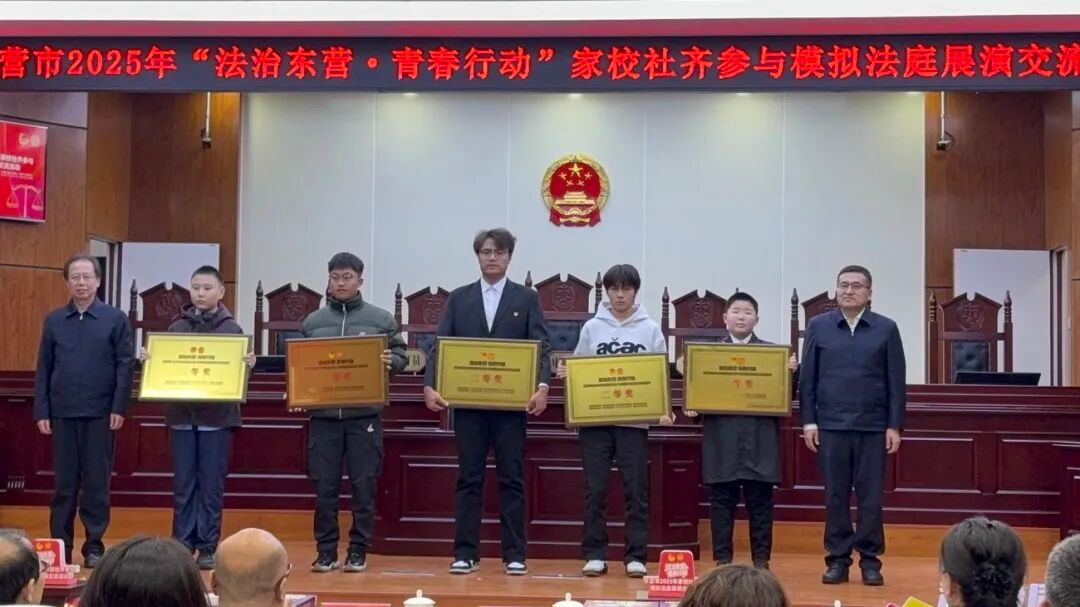12月8日-9日,东营市2025年“家校社齐参与模拟法庭”展演交流活动在利津县法院第一审判庭举行。全市共15支队伍参赛,我校代表队大学生艺术团语言部的19名学生参赛,由徐冰玉、王晓担任指导老师。代表队凭借出色的发挥,最终获得团体二等奖的佳绩,徐冰玉、王晓获评“优秀指导教师”称号。