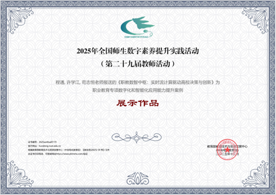 近日,由教育部教育技术与资源发展中心(中央电化教育馆)举办的2025年全国师生数字素养提升实践活动(第二十九届教师活动)评选结果正式公布,我校程通、许学江、苟志恒老师申报的《职教数智中枢:实时流计算驱动高校决策与创新》职业教育专项数字化和智能化应用能力提升案例获评为全国展示作品。