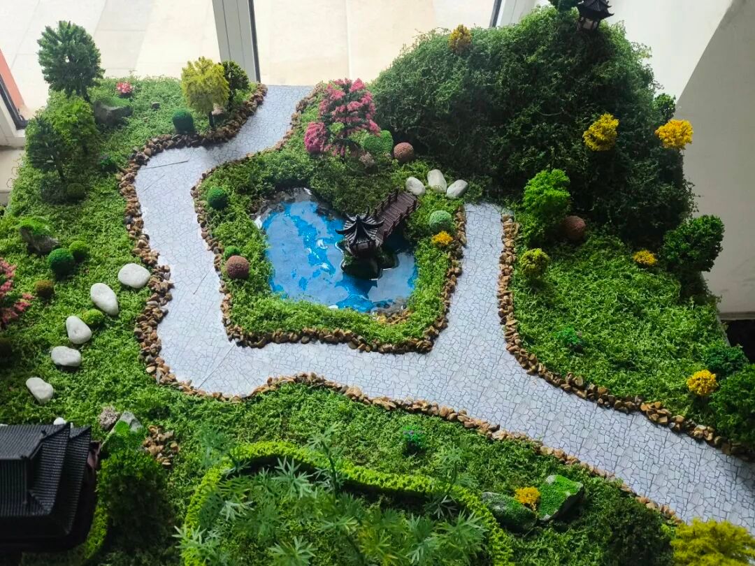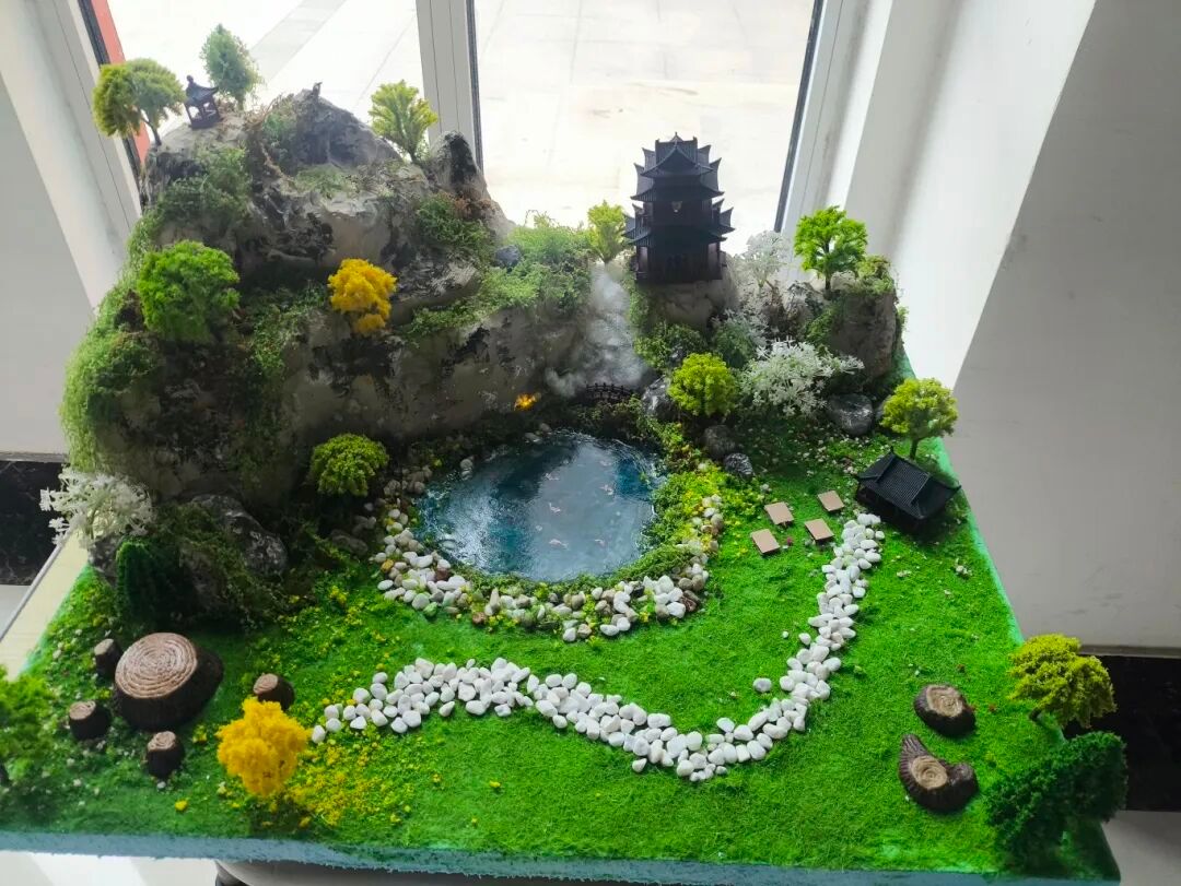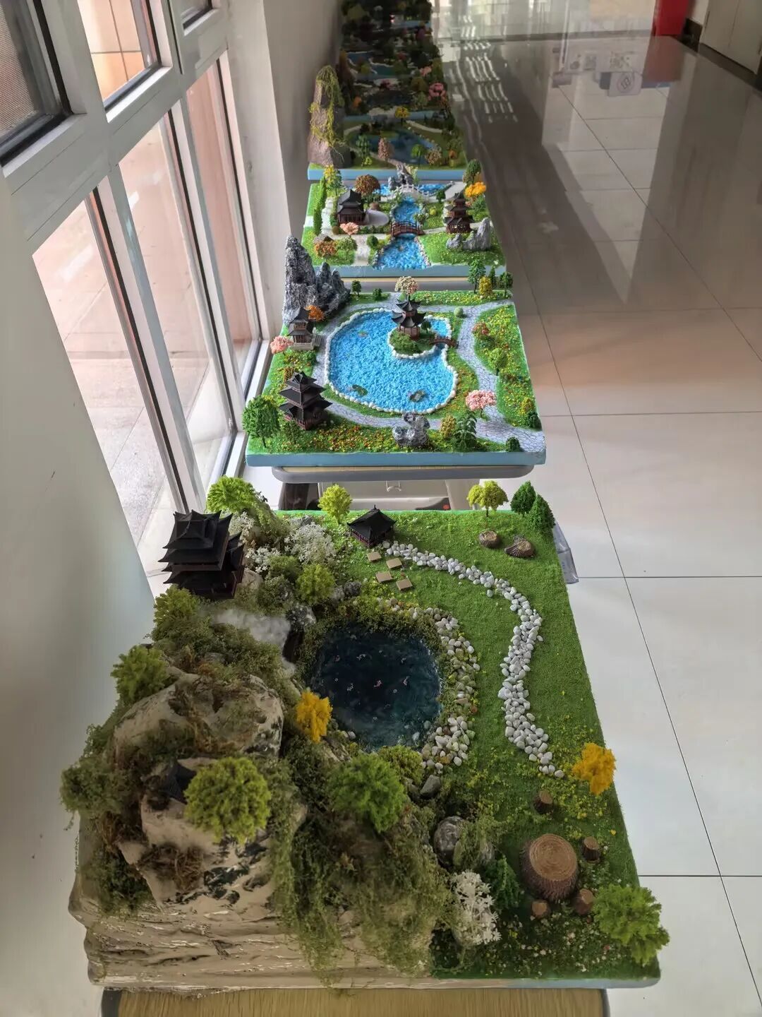 景观模型:以尺为笔,绘就生态蓝图景观模型展区里,30组学生作品格外吸睛。这些作品以1:100的比例,精准还原了50米×60米地块的景观设计,主题涵盖城市公园、社区广场、滨水绿地等多种类型。创作过程中,同学们严格遵循地形、水体、植物、建筑这四大造园要素,每一处细节都透着专业范儿。