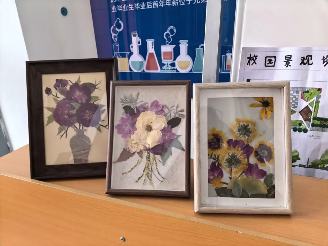 压花创作:以花为媒,激发自然灵感压花艺术展区以“自然与人文的对话”为主题,同学们走进校园,收集了月季、绣球、杜鹃、十大功劳等多种植物的花材和叶材,经过脱水、压制等工序,创作出一幅幅别致的立体压花作品。