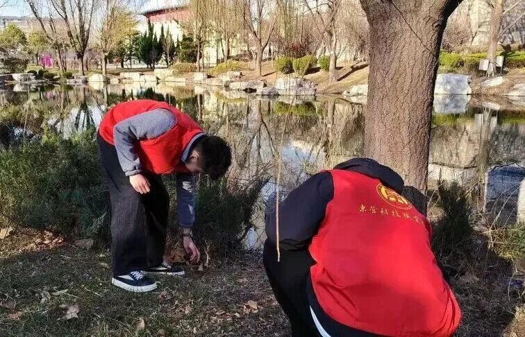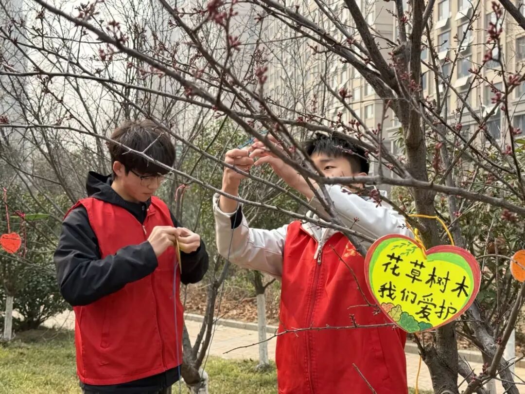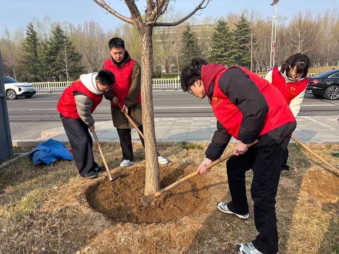 各学院志愿服务队还纷纷走出校园,深入社区、公园,用实际行动守护绿色家园。航空与旅游学院志愿者前往广饶县五村遗址公园,手提水桶为树木浇水松土,精心绘制并悬挂文明提示牌,引导市民共同守护城市绿肺;教师教育学院志愿服务队走进顺安社区大海丽苑小区,亲手制作环保绿植树签为绿植挂上专属“身份牌”,与社区工作人员携手开展绿植养护、环境清理工作,清理杂草、维护绿地,让社区环境更加整洁美观;汽车工程学院走进孙子文化园,师生共同参与植树、培土、浇水等环节,以实际行动美化环境。大家分工协作,认真完成每一步操作,现场氛围热烈。此次活动不仅让学生亲近自然、体验劳动乐趣,更以实践育人方式深化生态文明教育,引导青年以行动守护绿色家园。春寒料峭中,志愿者们的身影成为春日里一道道靓丽的风景线,用实干诠释青年担当。